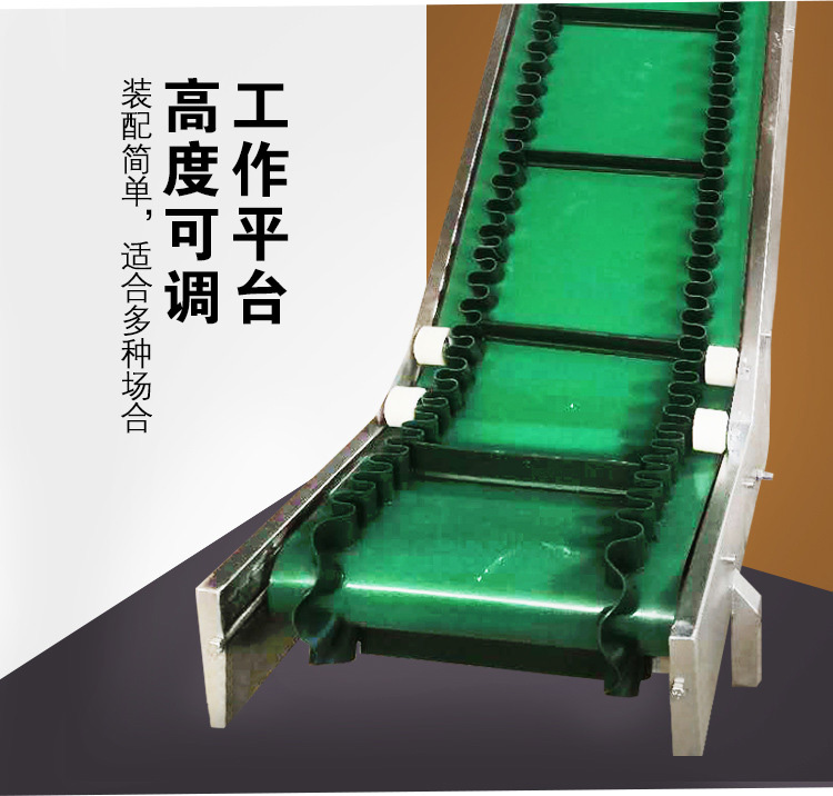 裙邊皮帶輸送機是在平形橡膠運輸帶兩側粘上可自由伸縮的橡膠波形立式"裙邊",在裙邊之間又粘有一定強度和彈性的橫隔板組成匣形斗,對物料進行連續輸送的設備。可大傾角輸送甚至垂直提升散料。